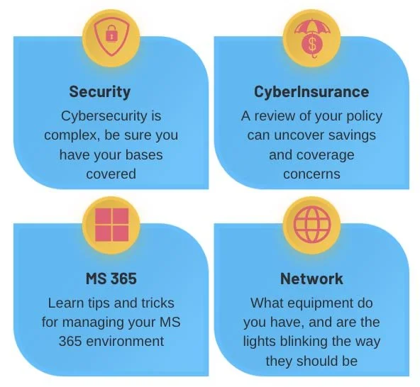 Our Foundational IT Assessment covers 4 key areas of your IT: Your network, Microsoft 365, Cyber Security, Cyber Insurance.